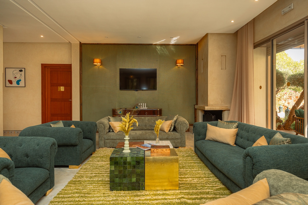 Grande maison avec Piscine, pour se retrouver en famille ou entre amis, jusqu’à 13 personnes. En toute tranquillité. Gardiens sur place à votre disposition . Il y a 5 chambres et 4 salles de bain , une cuisine , un grand espace salon intérieur avec une grande cheminée et un grand espace repas l hiver . Espace repas également dans le jardin l été . Une grande terrasse panoramique d où l on peut voir la chaîne de l atlas et le coucher de soleil .