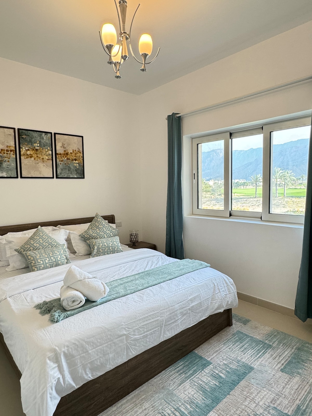 Exquisite, fully furnished 2-bedroom apartment (Mountain view) located in sublime muscat bay community. Well suited for family or friends longing to have a peaceful stay in the scenic beauty of Muscat bay. Located adjacent to Jumeirah Hotel and having private access to the bay, pool, playgrounds and children park.