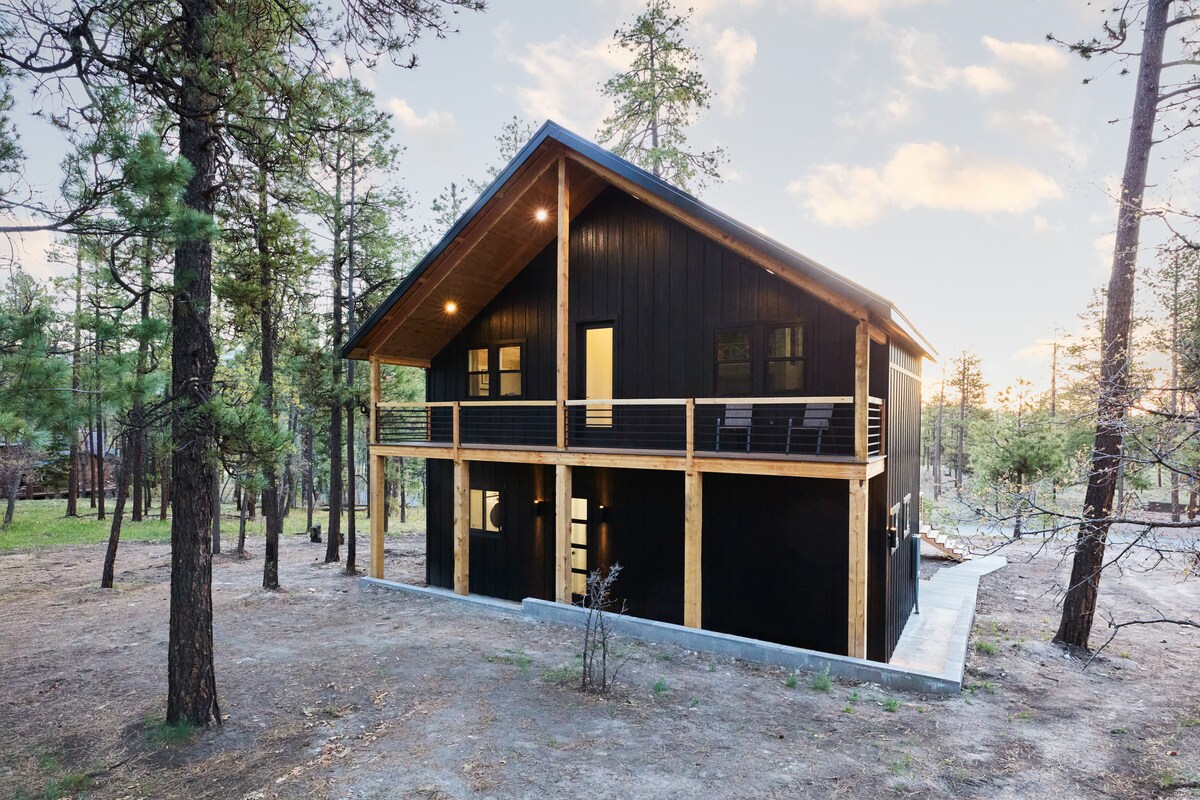 Raven House is a brand new luxe cabin in the most beautiful mountains ofArizona. A ground level primary, king bed and soaking tub, a custom bunk room with three full beds built 3 stories high. Watch the visiting elk from balconies on three sides. Cook together in a beautiful designer kitchen with a huge island then share meals from indoor dining room that seats 10. Grab your coffee from a stocked coffee bar and watch the sunrise in the observation loft, or enjoy a glass of wine from the deck.
