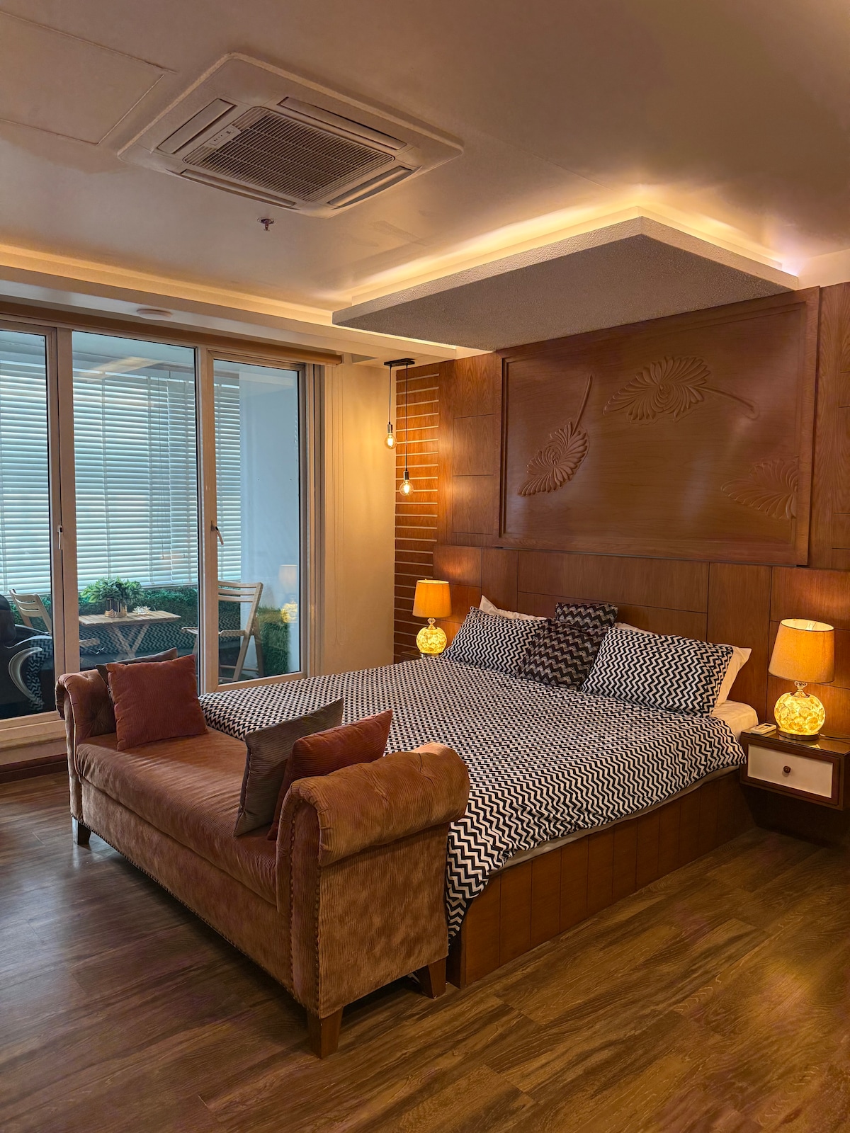 Welcome to the professionally run Scandinavian-style 2BHK suites located in the heart of Ranjit Avenue, Amritsar! Designed by renowned designer Vaibhav Khanna, our suites offer a unique blend of minimalistic design and cozy warmth. As you step into our suites, you'll be greeted by a bright and airy living room with modern furnishings and plenty of natural light. Two bedrooms offer comfortable sleeping arrangements for up to four guests with provision for extra bedding ( charged extra ).