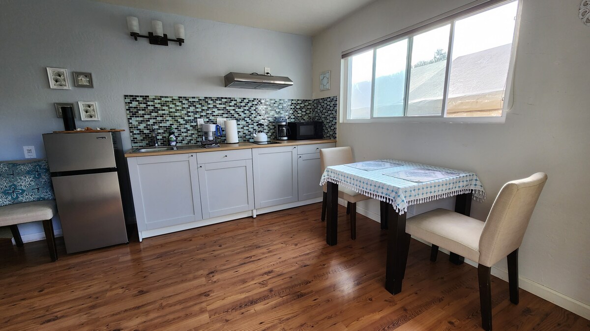As an artist, I'm deeply interested in aesthetics. I think I've succeeded in creating a beautiful, restful venue for relaxation. The queen size bed overlooks a bird sanctuary over the Valencia Creek watershed. The kitchen includes a fridge stocked with goodies, toaster oven, microwave, coffee pot, French press and cooktop for light cooking. You're welcome to use the oven/stove in the main kitchen with prior arrangements. A backyard gas barbecue is available for heavier cooking (or if you're planning to cook fish!) Hairdryer and shampoo are available in the spacious private bath. Thick terry robes are provided for your comfort, and beach towels and chairs if you decide to spend some time on one of our beautiful beaches. There's a large flat screen smart TV complete with Netflix. Lots of reading material and a writing desk are also here for your use. You have a private entrance with a coded entry. You have a private entrance with a coded entry. Your rooms are private and you have your own porch and you're welcome to use the yards/patios. I share the front house with my partner and our two dogs. We'd love to meet you and perhaps share a cup of coffee or a glass of wine (depending on the time of day!) but will also respect your need/desire for privacy if you prefer. I'm happy to provide any information or amenities that will make your visit more comfortable and enjoyable. This home is close to the beautiful beaches of the Monterey Bay Marine Sanctuary and the Forest of Nisene Marks, just a mile from Aptos village, south of Santa Cruz and the Boardwalk and north of Elk Horn Slough and The Monterey Bay Aquarium. Parking is easily available on our quiet cut-de-sac. The flagstone path to the left of the property will lead you to a gate and your private porch/entrance. Provide a 4 digit code before you arrive and I'll program the entry for your convenience. No keys to hassle with. Public transit is available one mile from the house. Uber is a popular alternative in our area. We're just minutes away from a thriving downtown scene complete with music venues and restaurants, shopping, art galleries, and the SC Beach Boardwalk. Whale watching, kayaking, cycling and hiking trails are also just minutes away. My place is good for couples, solo adventurers, business travelers, or those looking for a quiet retreat.