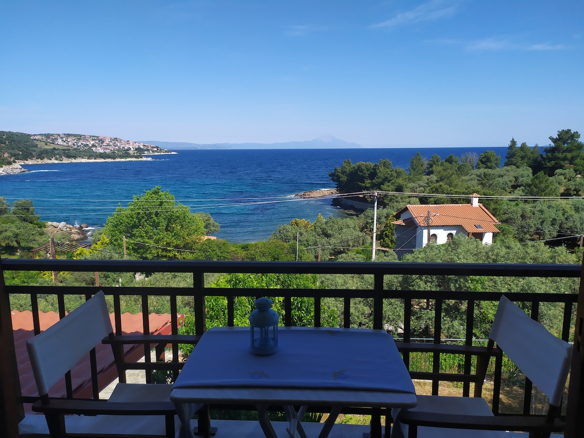 Escape to the charming village of Pyrgadikia, where Bellevue – Panoramic Seaview Penthouse awaits you. Nestled in the picturesque Sithonia bay in Chalkidiki, our holiday penthouse is designed to take full advantage of the beautiful views, with large windows and glass doors that open onto three balconies offering panoramic views of the Aegean Sea and the Holy Mountain of Athos.