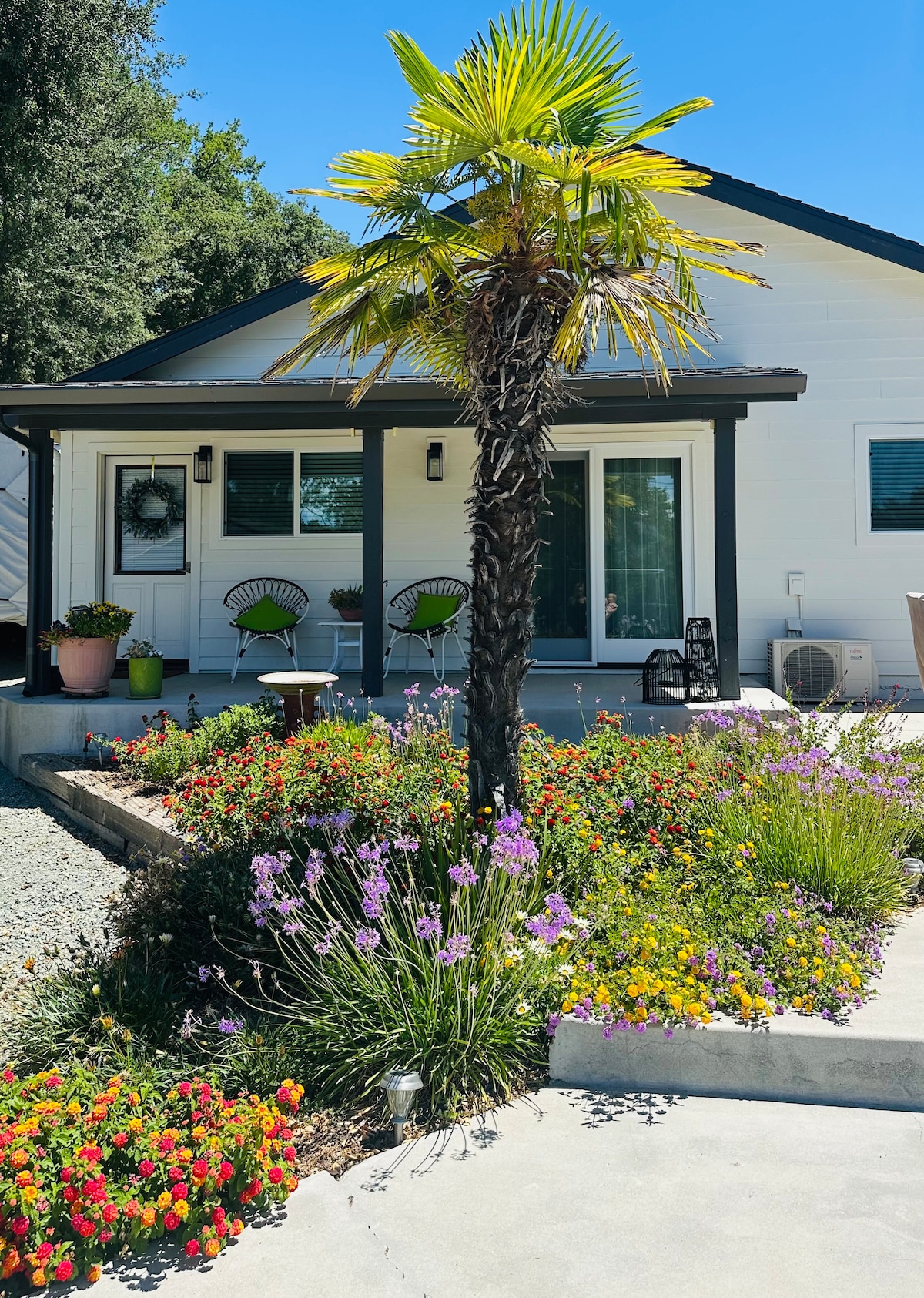 This light and airy hideaway was designed and built by the host incorporating her own handiwork in art and furnishings. Initially a granny flat, it's been transformed into a comfortable and spacious hang out. Its central location makes it ideal to explore the area. There is plenty to do on site; barbecue, play corn hole or horseshoes have fun with games and cards kept in the hall, enjoy the pool and hot tub in the warm season. May to Sept. The twin beds can be easily configured to a king bed. Price includes a 13% local occupancy tax. Your cottage opens up to the pool area which maybe available during the summer months but not guaranteed as this pool is too deep for kids to stand in. There is also a hot tub open from March to Dec. So the key to open the pool is subject to conversation. The pool is shared with us. No parties please. This is a non smoking property. We love dogs but we can not allow pets brought in. We have a large dog and cats. We kindly ask for slow driving up and down driveway as the animals are slow to move as they own the space. These are accommodations you wont find at a hotel. We are not one, this is our home we are opening to share with you. We are next door most times if you have any questions otherwise we will respect your privacy. The guest house sits on three acres with the main house where the host lives with her husband. It is just one and a half miles to the freeway and town. Four minutes to restaurants and grocery stores. There are chickens, 2 baby gosts, and a rabbit on the property along with cats and a large dog, Jules, who is sure to greet you. The pool will be opened to guests that can swim only as the shallow end is quite deep. Opened when the temperature increases in the summer months. A cold pool is no fun to swim in. The hot tub is open in March to Dec. Contact hosts if plan to use.