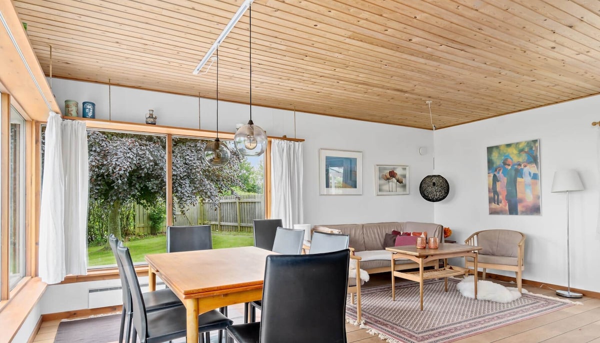 Indoor The cottage contains a kitchen with a dishwasher, a dining and living room with a wood-burning stove, a heat pump, and a terrace. In addition, there is an entrance hall, a bathroom with a washing machine and 3 good bedrooms - 2 bedrooms with double beds (140x200) and 1 bedroom with a bunk bed and a single bed (90x200). Outdoors The house has a lovely terrace that surrounds the house. Here are both covered and open terraces with sun loungers and cozy corners as well as a cozy garden shelter with a fire pit. 1 pet allowed.