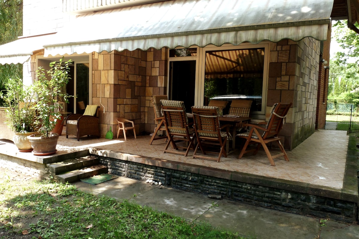 Relax at our spacious guesthouse just 800m from Lake Balaton`s shores. Situated in a quiet, upscale area by a lush forest, offering 3 cozy air-conditioned bedrooms (2 balcony), 2 bathrooms and a bright living room with a fully equipped American kitchen opening to a terrace & private garden. Enjoy 3 nearby beaches, sailing, drinks at the harbor, or a quick 4 km drive to the ferry for a day trip to Tihany and the scenic north Balaton. This charming retreat is your perfect peaceful getaway.