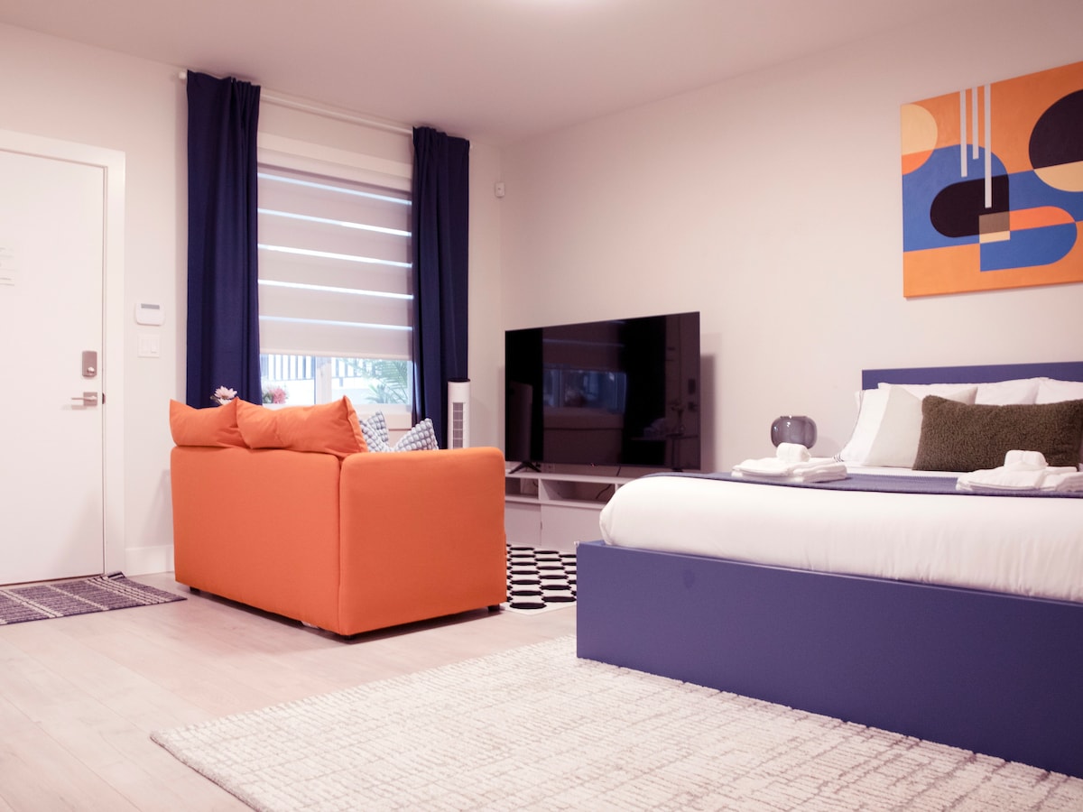 A peaceful, private space to relax, reset, and be inspired. Enjoy beautiful views of the mountains, water, and fairy lights — and most of all, good vibes. This luxury studio features a comfy king mattress, a big screen smart TV, and a low-profile writing table perfect for work or enjoying a cozy meal. Step out to the patio, where you can curl up with a book on the loveseat and watch the sunset in total tranquility.