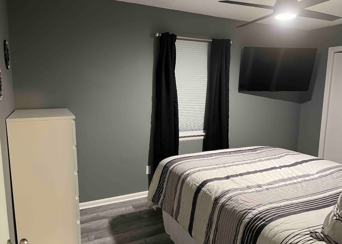 Cheerful 2-bedroom cottage four miles from stadiums with free parking on premises. Family friendly with country feeling close to the city. Bathroom has a walk in shower. Large fully stocked kitchen with separate dinning area. Refrigerator with ice and water through the door. The kitchen has a dishwasher and a washer and dryer laundry area. Plus an added bonus a fully stocked coffee bar. Also added is a EV 240 volt receptacle for charging EV over night.