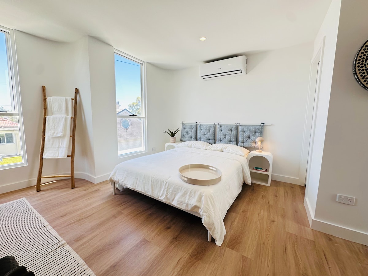 A dream coastal getaway yet conveniently located just 10 minutes from Sydney airport and 20 minutes from the city. This spacious Santorini-inspired loft studio is perfectly situated with the beach, restaurants and cafes a short walk away. It features an open layout with a living space, kitchenette and calming interiors. Unwind in the designer bathroom, a sanctuary with a serene aesthetic, perfect for refreshing after a day by the ocean. This curated space offers comfort, convenience and style.