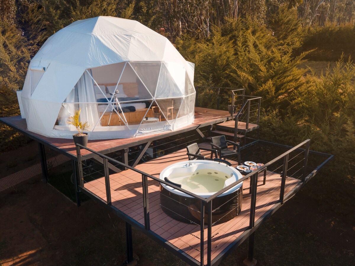 Escape to luxury and tranquility with our glamping experience! Immerse yourself in nature without sacrificing comfort in our beautifully furnished domes. Enjoy stunning views, cozy bedding, and modern amenities. Book your getaway today! The Domo has TV, Wifi, Netflix , yoga mats, boardgames and a private toilet. In the resort you can enjoy the swimming pool, volleyball and football pitch, ride horses and if you like to fish you ca do so in the lake.