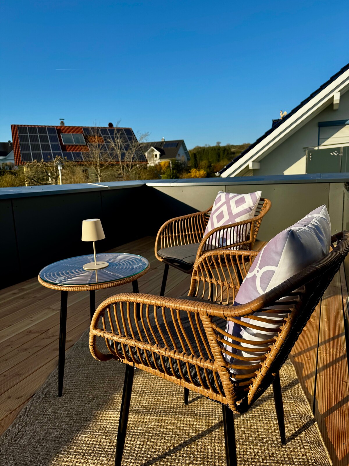 The lovingly renovated attic apartment with loggia offers stunning panoramic views of the Neckar Valley and the Kraichgau. There is an open kitchen, dining, living area and 2 bedrooms. A ladder staircase leads to the converted attic. The turn-of-the-century estate with sheep pasture and spring is located in front of the walls of the historic Dilsberg Castle and invites you to relax. We ask that you observe the quiet hours from 10 pm.