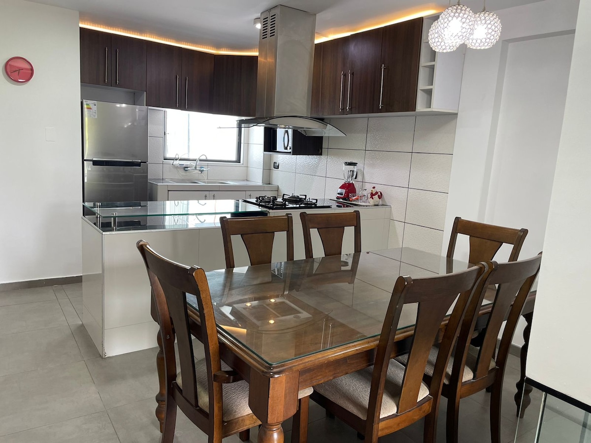 Beautiful fully furnished apartment on the 1st floor with 3 bedrooms (for 6 people), equipped kitchen, living room, dining room, 2 full bathrooms, patio and laundry. It has excellent finishes, Wi-Fi, 3 Smart TVs, hot water and all the necessary appliances and utensils in the kitchen to make your stay more pleasant. 5 min from the Airport and the Otuzco Windows, 6 min from Baños del Inca, 15 min from the Cajamarca Main Square. 24/7 availability for any questions.