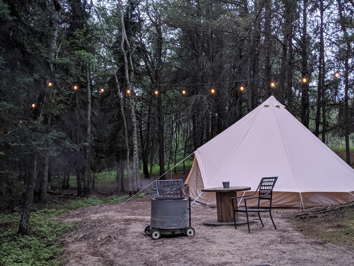 Site 2: Our campsite is situated deep in the boreal forest. Nestled between the pines and aspens, you'll sleep beneath the stars in a queen-size bed. The site is private, away from the access road and the other site. Equipped with a fire pit, chairs, and a table. Designed with privacy in mind, our hidden gem offers tranquility and beauty. Our cozy tent is completely off-grid. There is no power or running water in the space. Guests are required to remove all garbage from the site upon checkout.