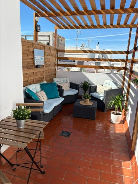 Enjoy a luxury experience at this centrally-located home. Your private terrace overlooking the sea and the main square of the village will make you enjoy the charm that Conil has. A 5-minute walk to the beach and downtown. It has everything you need kitchen utensils, air conditioning in all rooms, TV in the living room and bedroom, porch with table and chair in the entrance and dining room also on the terrace overlooking the sea. Totally new and looking at the detail.Ta