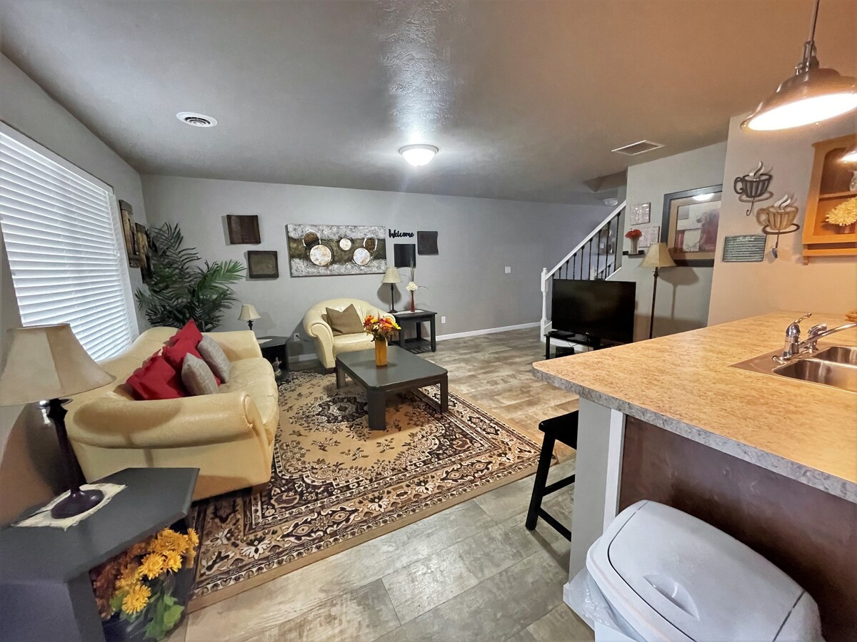 Take it easy at this unique and tranquil getaway. Nestled in a quiet neighborhood in a small town not far from interstate 90 this home features all the amenities of larger home in a cozy package. Gas and groceries not far away. Enjoy the safety of a small town in the Midwest. Kitchen, Living room, loft, 2 bedrooms, pullout bed in couch, pack and play, washer and dryer. Smart TV in loft separate from living room. Kitchen, bathroom, living room, bedroom, laundry are all on ground level.