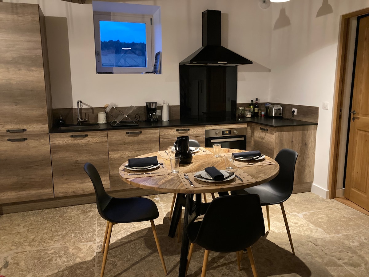 In a beautiful stone house "Les Logis Bourguignons", "Campagne" is a large ground floor apartment with terraces and garden. The charm of wood and stone. Ideally located in Saulieu, at the gates of the Morvan and the Gold Coast! Large living room, kitchen-bar, wood burner, 2 beautiful bedrooms (double beds) with desks, walk-in shower. Two terraces and garden (barbecue). Tastefully equipped, ideal for discovery and/or work stays, families or two couples.
