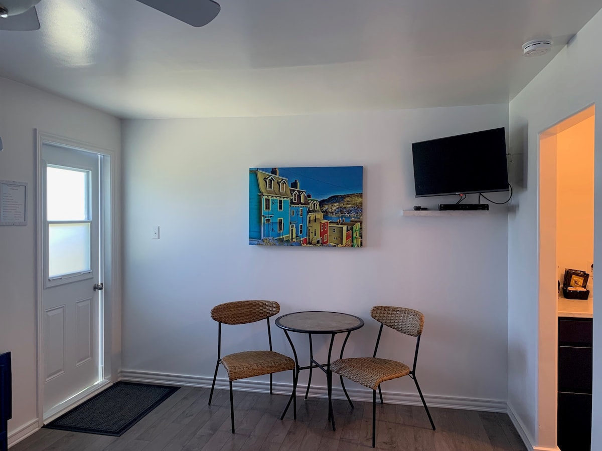 We offer a private ground level space in our house equipped with a bedroom with ensuite and living area. We also have a fridge, microwave and coffee maker for light snacks. You will enjoy the spectacular view of the ocean from every window. With the beach being steps away, icebergs, whales and wildlife can be seen. You can also enjoy having a campfire . Hiking trails are also close by.