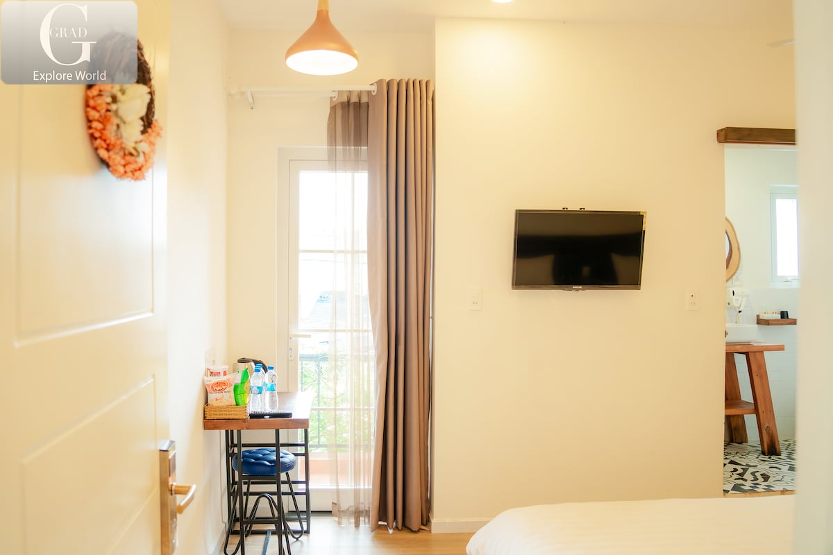- Phòng 17m² có cửa sổ, được trang trí với tone màu xám hiện đại cùng khung tranh cảnh đồng quê – tạo cảm giác vừa ấm áp, vừa phóng khoáng. - Căn phòng tuy không quá rộng nhưng đón ánh sáng tự nhiên và gió mát từ cửa sổ, nhìn ra khoảng không thoáng đãng bên ngoài. - Nước nóng 24/24 cùng đầy đủ tiện nghi: máy sấy, bản là, bình đun,... - Smart TV với Netflix miễn phí để bạn thư giãn sau 1 ngày khám phá Đà Lạt. - Dọn phòng hàng ngày miễn phí và thuê xe máy có sẵn.