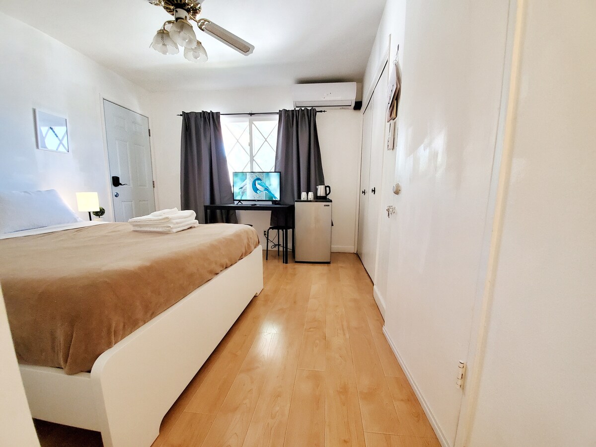 ABOUT THIS LISTING -All private SELF CHECK IN -Private entrance (will give instruction) -Private mini Patio -Lots of street parking (safe and no restrictions) -Private room and 1 bathroom -1 Queen size bed -Split type Ac/heater -40" Smart TV, antenna channel only -Hair dryer -Towels -toilet paper -House shampoo -Body / liquid Soap -Iron and iron board. -Mini fridge -Water kettle -2 seramic cup Outdoor camera for security purposes. Camera facing the walkway of the entrance