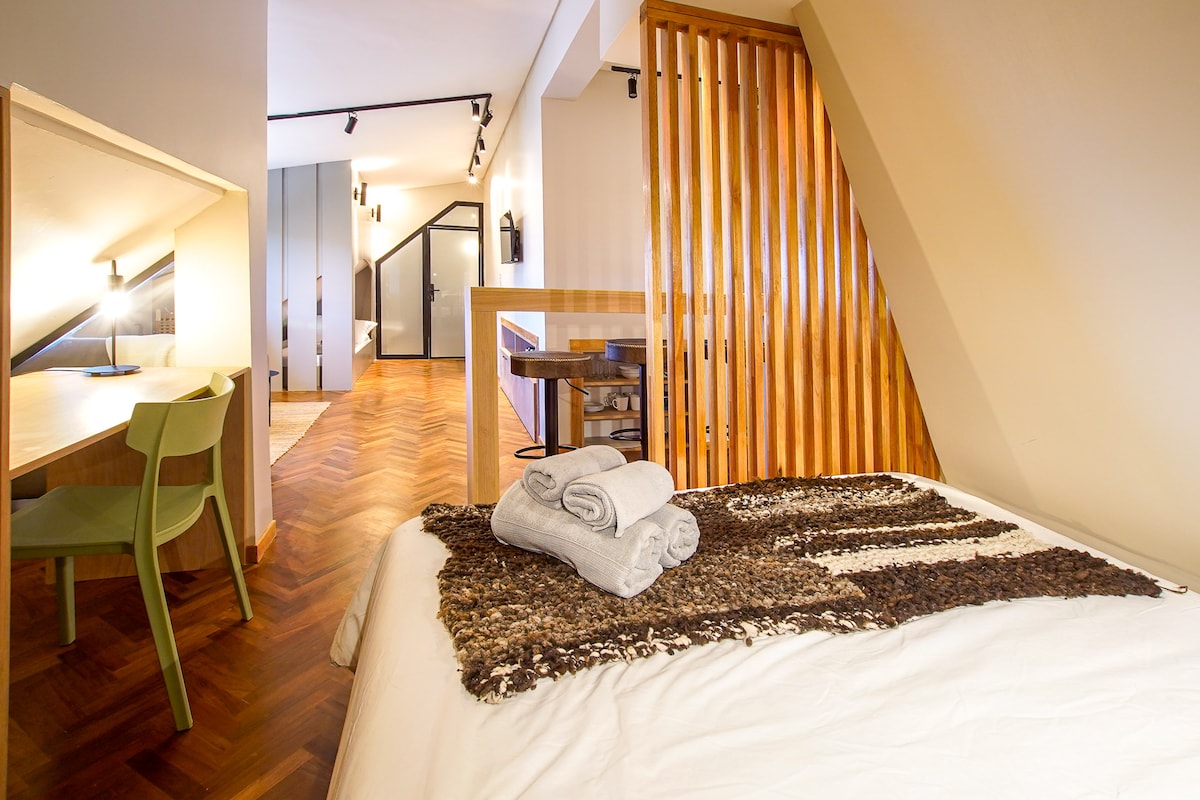 Studio apartment on the ground floor surrounded by nature and with a very good view of Lake Nahuel Huapi. It is located 15 minutes away from the city. It has a king-size sommier or two single queen-size beds, an armchair that converts into a single or double bed. There is a desk in the same room. It has a large and complete kitchen-dining room. It has a beautiful and spacious balcony and a small garden. Equipped with a 43-inch Smartv, Alexa assistant, pitcher, toaster, blender, and coffee maker.
