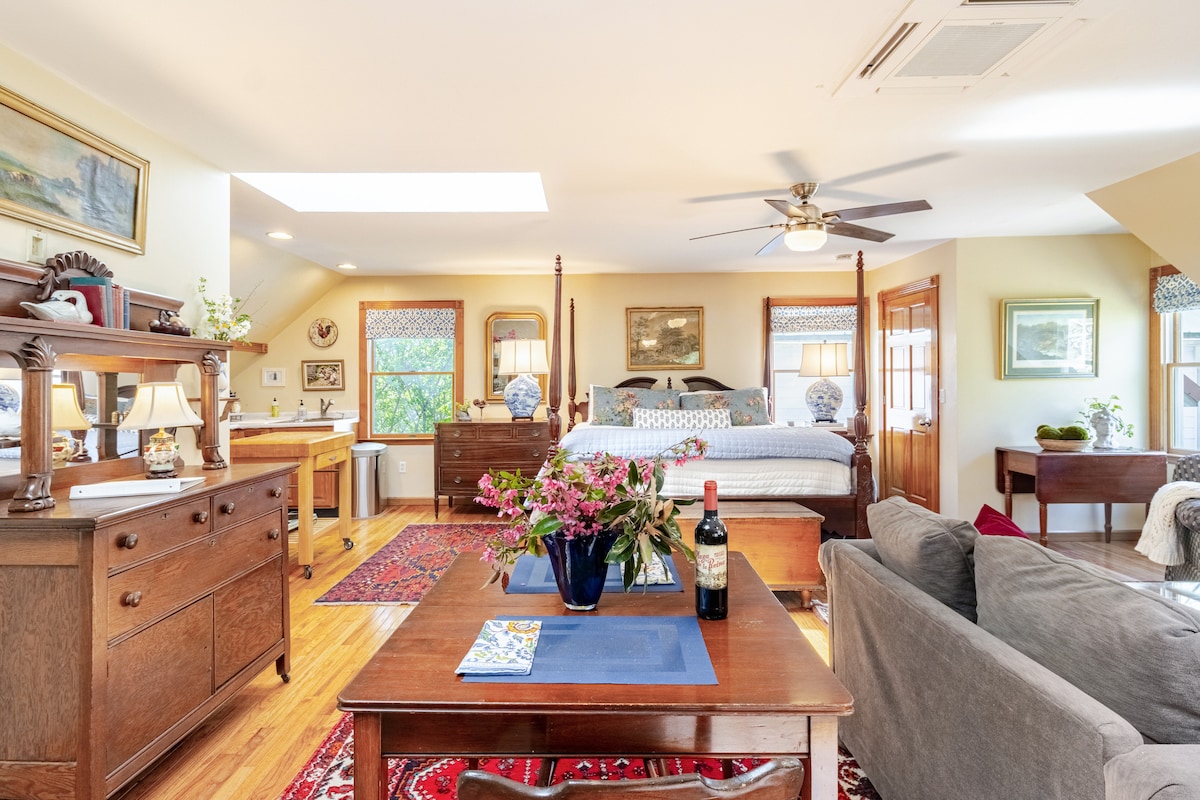 Escape to a secluded studio hideaway in the middle of Chestertown. Private parking, and over 1 acre of private gardens. Relax in front of the fire with views of gardens in the windows. Kitchenette has large toaster oven, hot plate, microwave, fridge, and Keurig/drip coffee makers. We have an under counter filtration system for pure delicious drinking water. King bed with deluxe linens and mattress, washer dryer. We also host ‘Wren Retweet”, a 5 bedroom house by the carriage house.