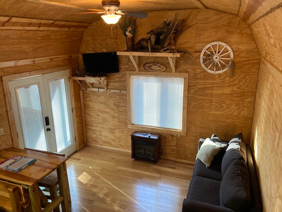 The centrally located, Cardinal cabin offers a birds eye view of Mountain View. This quaint little cabin boasts a master room with a queen day bed with full trundle bed underneath, spacious living room with recliner and sleeper sofa, full size full stocked kitchen with kitchen table and roomy bathroom with shower/bathtub combo. You’ll enjoy all that Mountain View has to offer with only a 10 minute drive to the town square.