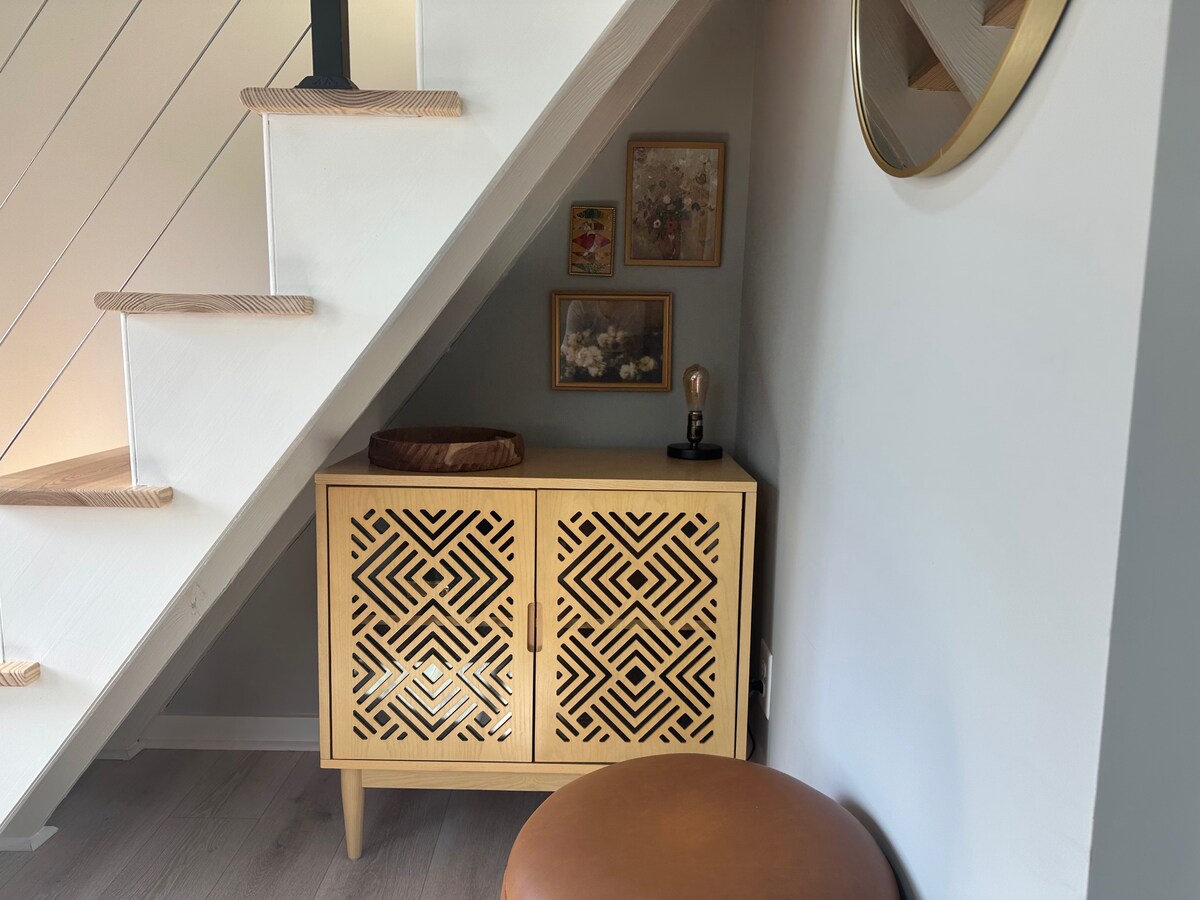 A guest suite that's a former artist studio with 10-15 foot high windows and 20 foot high ceiling, converted into one bedroom loft with private entrance, bath, living area, and kitchenette. The space is attached to the rest of my house, but you'll have a private entrance, your own bathroom, living area and kitchenette and two seat dining table. You will not have access to a full kitchen. New in September 2025: Blackout curtains provide privacy at night and a darker room for sleeping in.
