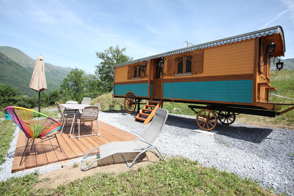 Let yourself be tempted by an unusual stay in a Gypsy trailer.Located on the heights of Luz st Sauveur,in a pretty meadow at 920 m altitude,in the heart of the High Pyrenees.You can enjoy the calm and the exceptional view of the summits. Summer and winter, it will bring you all the comforts you need for a cozy and pleasant stay. A large alcove bed of 160 x 200 and 1 small bed 1 m 60 for a child, a bathroom with a large shower and an equipped kitchen.