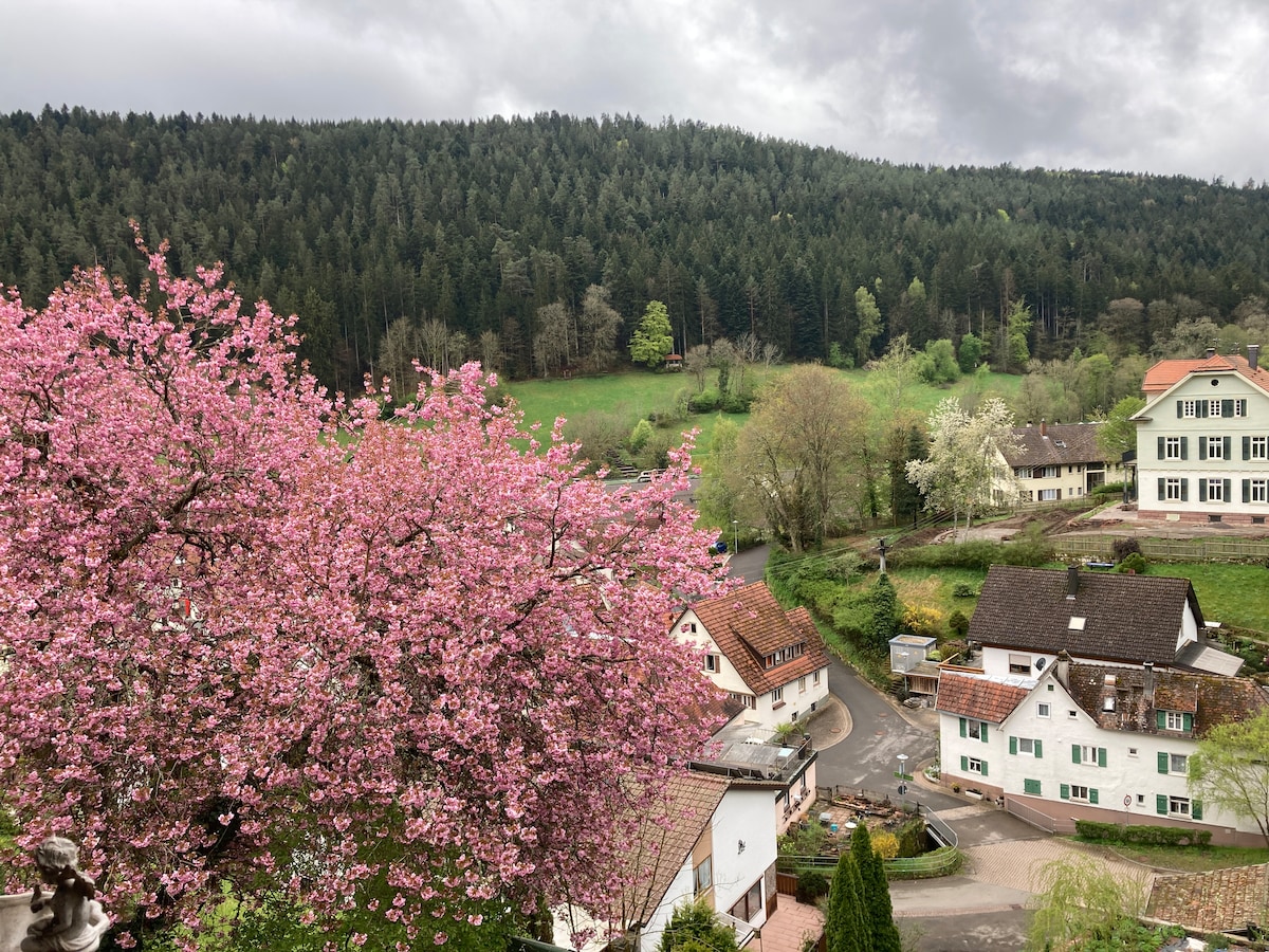 Soothing tranquility, the view of the valley and the forest, high-quality furnishings and a large balcony – pure enjoyment. Hiking trails at your doorstep and great restaurants as well as the thermal baths in Bad Teinach - everything is there for a relaxing and enjoyable stay. The fully equipped 1-room apartment is the perfect place to unwind, to be active in the surrounding nature or to explore cities such as Nagold, Wildberg or Calw.