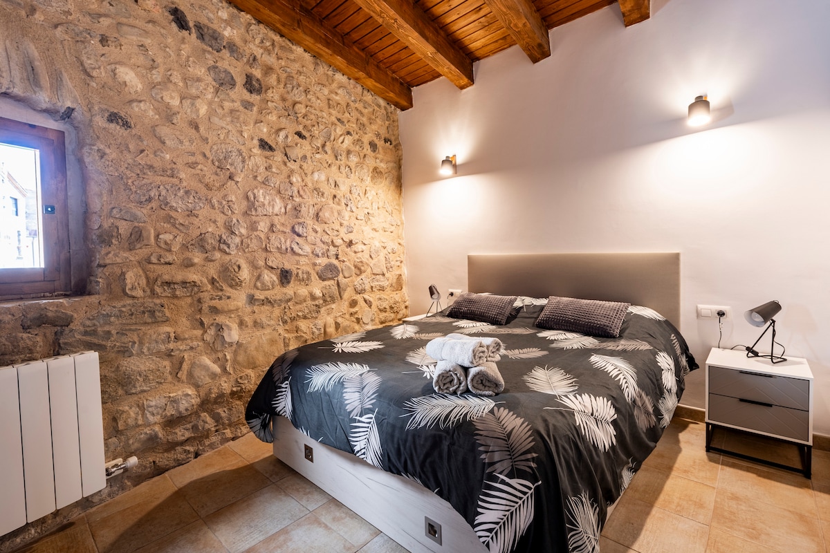A nice 50 m2 apartment, recently renovated, with a rustic-modern style that makes it very cozy. It has 2 bedrooms, 1 bathroom, and a kitchen-dining room with an American bar. Located in the historic center of Besalú, where you will find restaurants, bars, shops and a lot of history. Very close to a natural environment next to the Fluvià River.
