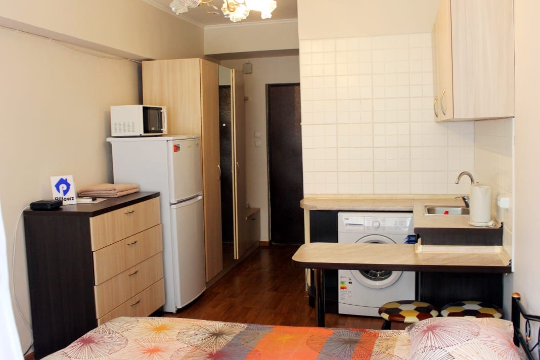 A stylish modern flat is a great option for leisure and business trips. Located in the center of Almaty, 100 m from Abaya Street. Nearby are the circus, the Sports Palace, the Republic Palace, the central stadium, the cable car, Lermontov Theater, Mukhtar Auezov Theater. The studio is fully equipped for 2 people: a sofa, a double bed, a kitchen area with necessary appliances, a bathroom, a large TV and high-speed WiFi. Windows with mountain views and a quiet courtyard.