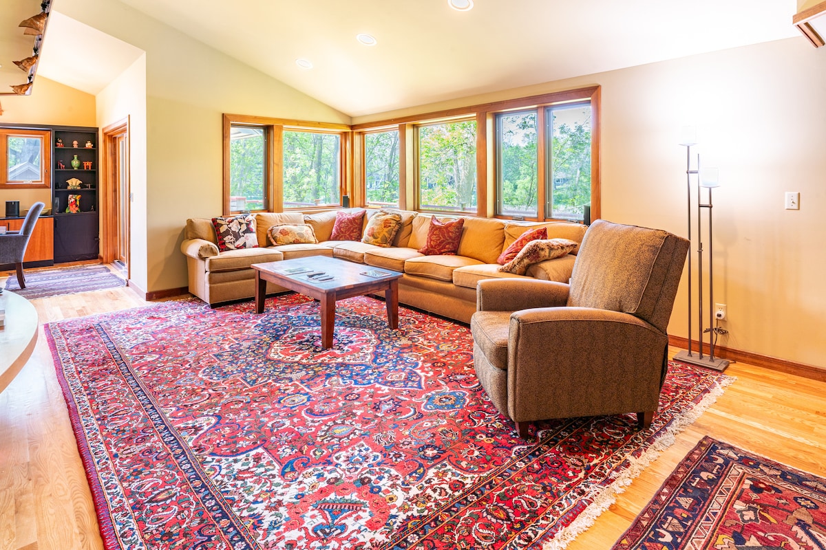 Escape to our 5,000 sq ft secluded forest home with private driveway access and ample privacy. Savor the stunning views from the many large windows and outdoor spaces, including a patio, screened porch, wrap-around deck, and tranquil koi pond. Stay productive with ultra-fast wi-fi and multiple workspaces. Indulge in luxury in the spacious main suite, featuring a jetted whirlpool tub and cozy gas fireplace. Conveniently located, it's just 15 minutes to downtown and 25 minutes to MOA & MSP.