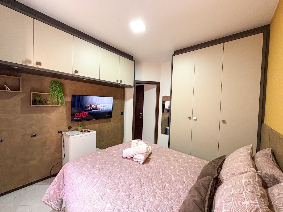 POUSO DO GUARANI | Suite with private entrance located in a residential area, inn style, with private bathroom and excellent location: 200 meters from the sea and 800 meters from the English center. Privacy, comfort and practicality: 240MB Wifi, TV, split air-conditioning, box bed, minibar, hairdryer, iron, electric kettle, microwave. The suite is located on the ground floor and because it is all made of wood, the noise of footsteps from the upstairs suite can be heard. It does not have a garage.