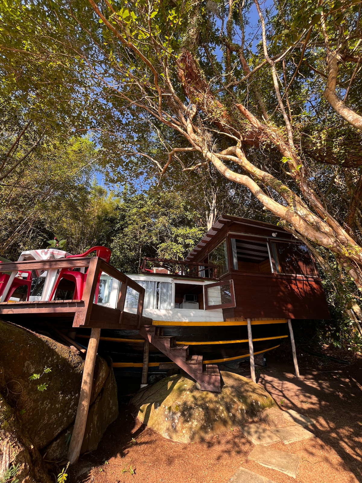 Casa Transmar is an exclusive lodging on a historic boat in Lagoa da Conceição, Florianópolis. Access is only by boat or trail. The house offers comfort and tranquility, and you can also enjoy a small beach just for you. Come live this experience!