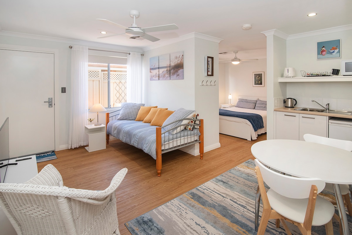 Gorgeous, self contained Studio, separate from main house. Central location, minutes walk to beach and Busselton Jetty. Cafes, bars and supermarkets all walking distance. Onsite parking Private entrance into sunny entry room. Sleeps up to 3 adults or 2 adults with 1-2 small children. Toddler bed and portacot on request. Efficient heating/cooling. Secure bike storage. A perfect base for tourists of Busselton and Margaret River Region or participants in local Sport or Arts Events. Self checkin