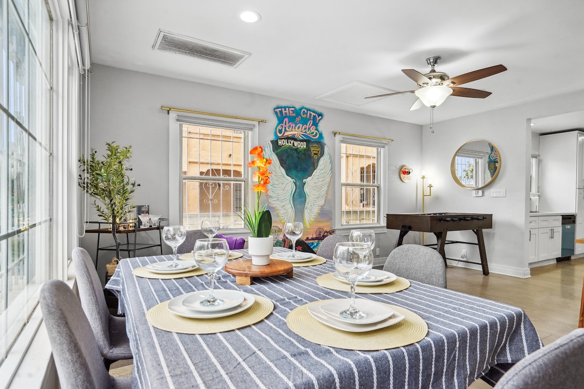 Kindly note: Our location is on W 12th St & S Rimpau Blvd, in Los Angeles. Please check the map for cross streets BEFORE booking! Exact address will be provided once booking is confirmed! LOW CLEANING FEE! Our Family-Friendly home is centrally located in Los Angeles & only 15-20 minutes away from LA's biggest attractions. Our home sleeps 11 and includes a Famous LA Mural, Foosball Table and plenty of activities for the kids to stay busy for hours! Come stay in our quiet and safe neighborhood!