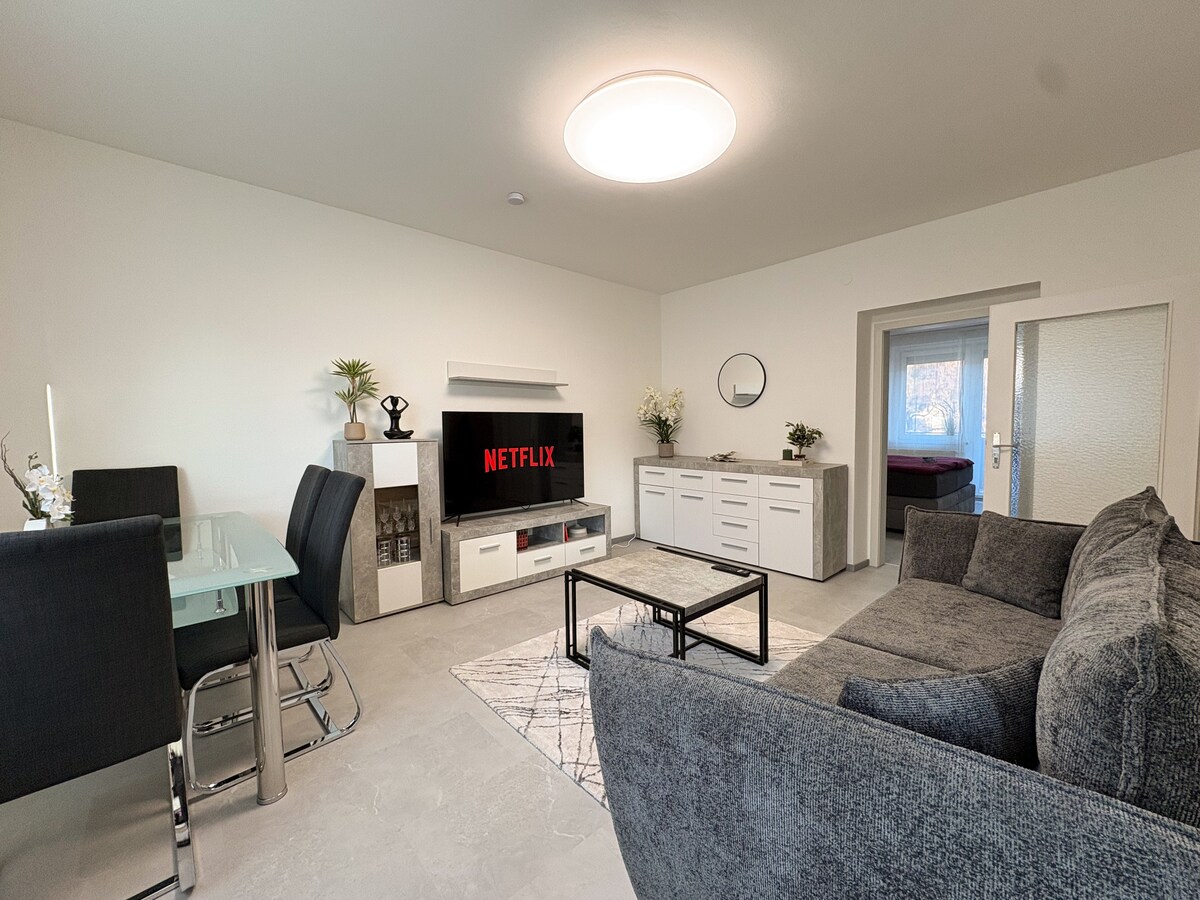 NEU renoviertes, barrierefreies 38m² Apartment in guter Lage: - großzügiges und neu eingerichtetes Wohn- & Schlafzimmer mit 1 Doppelbett (160cm) und 1 ausziehbare Schlafcouch (140cm) sowie 1 Esstisch für 4 Personen - Küchenzeile mit neuen Elektrogeräte (Microwelle, Nespresso-Kaffeemaschine, Wasserkocher, Toaster) sowie Kühlschrank - separates Badezimmer mit Dusche und WC (inkl. Fön & Badetücher) sowie Waschmaschine. Die Wohnung verfügt über gratis WLAN & Internet-TV.
