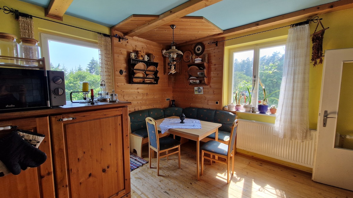 PLEASE READ THE DESCRIPTION carefully so that we can welcome you perfectly in our house. You will find a peaceful retreat, great hiking routes, a lot of silence and even convenient homeoffice. The basic price is for up to 4 people, including THE STUDIO (living room, kitchen, bathroom) and 1 BEDROOM . If you want a FURTHER BEDROOM (1 double bed) please BOOK 5 PEOPLE.