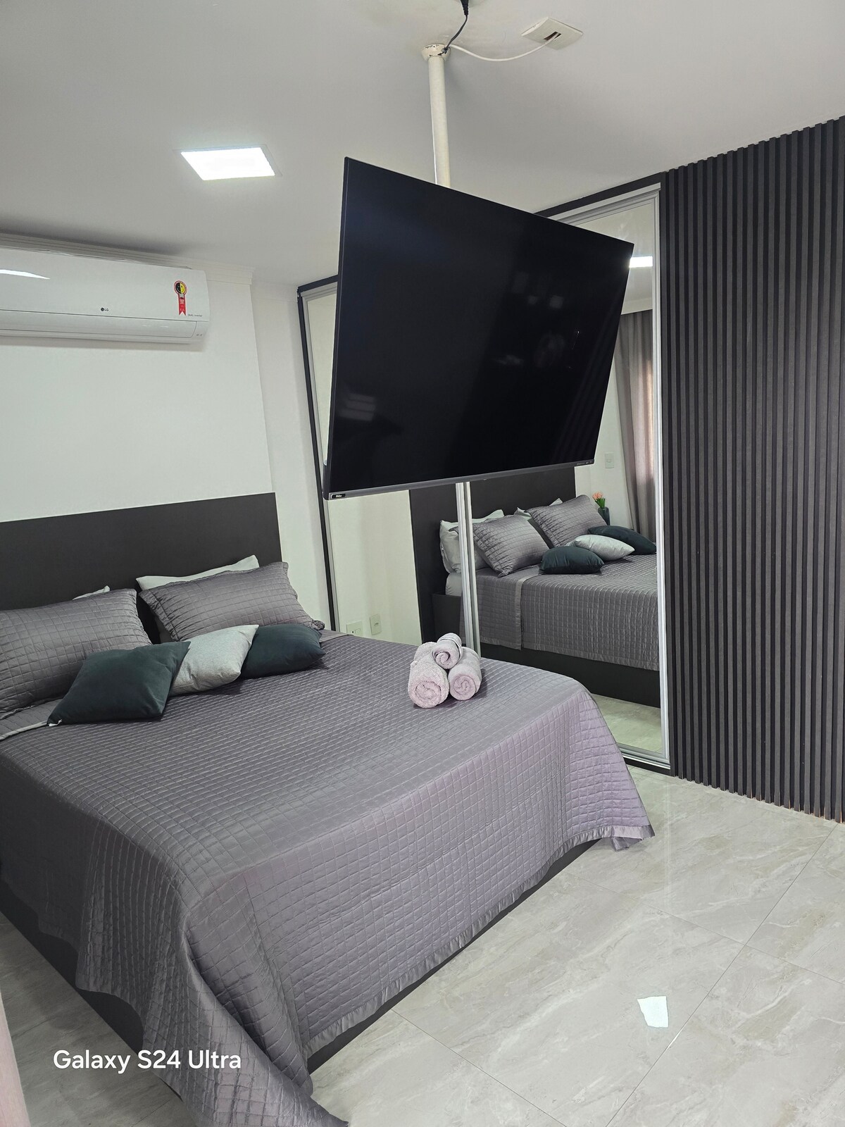 Brand new 1 bedroom,very cozy with: *Garage, *FitnessCenter, *Pool, *BBQ , * 24-hour concierge and security The Apartment is in the most famous and trendy neighborhood of Guarulhos. It has several gastronomic and entertainment options in the complex's space. It is located only 200m from the green Bosque Maia and 9km from Guarulhos Airport. Our space has 1 comfortable double bed, a sofa in the living room and we offer air conditioning, TVs, Wi-Fi, and ethernet.