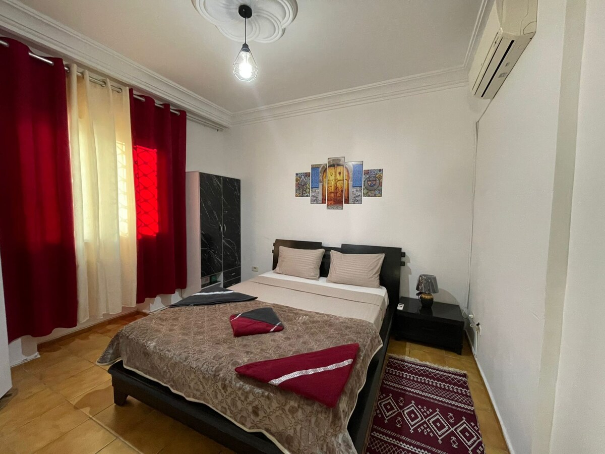 Situé au coeur de Hammamet nord . Au premier étage d’un immeuble , idéalement situé à deux pas de la route tousistique nord , de ses plages et du Palais des Festivals, charmant appartement de 100 m2 et entièrement rénové. Très bien aménagé et optimisé. Cuisine toute équipée ouverte sur le salon,ne suite parentalet et une chambre (2 lits simple) et sa salle de bain. Wifi, climatisation.