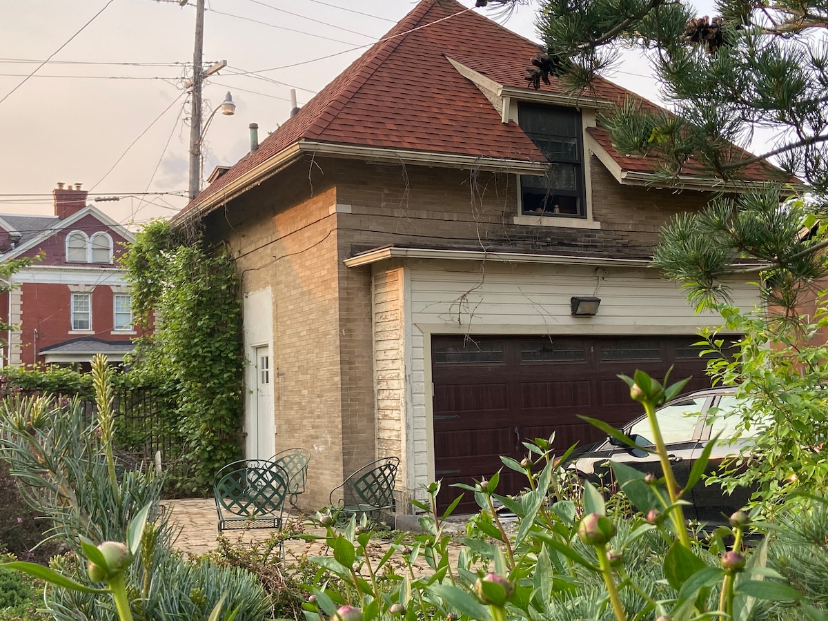 Kick back and relax in this calm, stylish space. You'll have a private space in a detached historic carriage house, sharing a yard with the host. We have a large yard with a patio near the carriage house, covered porch, grill, bbq pit, bocce court, and outdoor living room (summer). We have a dog that has yard access. Private, secured parking is available for 1 car. Families are welcome, as are pets. We recommend families 3+ contact us before booking to ensure the space will work for you.