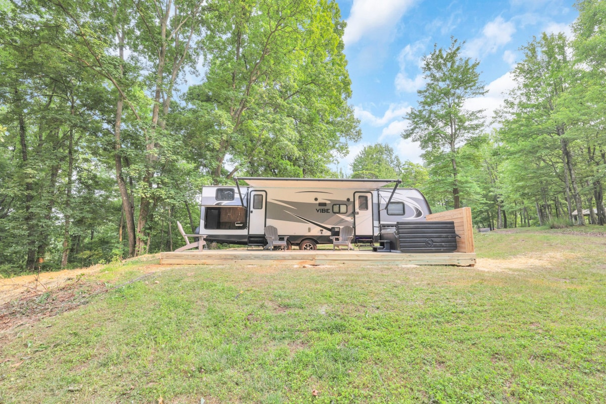 Affordable Getaway in Hocking Hills – Bigfoot Camper Vibes! Looking for a cozy escape that won’t break the bank? This is your spot! Perfect for couples, this updated farmhouse + retro-inspired Bigfoot-themed camper—tucked off the beaten path in the scenic beauty of HockingHills! What You’ll Love: • Cool Bigfoot & retro decor • A/C, strong Wi-Fi, & HD TV with Roku • Indoor shower & tub w real hot water • Comfy full-size 8” memory foam mattress • Outdoor grill & fire pit for starry nights