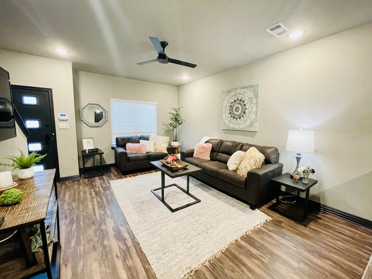 Relax in a brand new "Mid Century Modern" townhome located in the Historical Downtown Bryan & in walking distance to Ronin, Black Water Draw, RX Pizza, the Village, Cilantro & many more Restaurants. Master bedroom has a king sized bed & each room has 58 plus Smart TV.. Log into your personal streaming account or use our Hulu, Disney or ESPN, as a courtesy. Relax in private backyard with a beautiful view or cook in the beautiful kitchen which includes a Keurig coffee maker with pods & creamers.