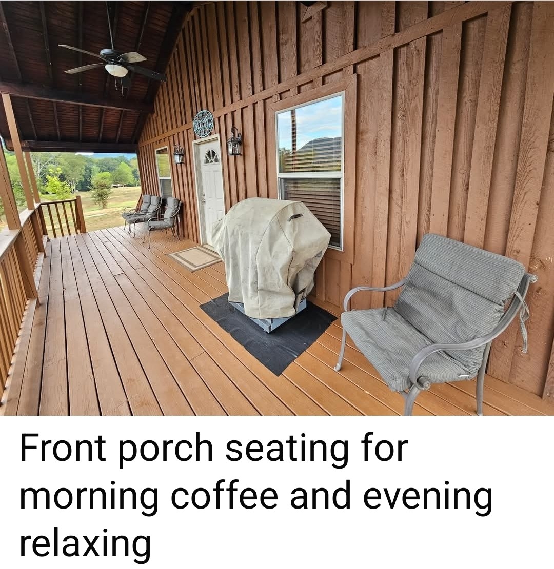 Our cabin sits on a bluff about 60-80 feet above the White River with a beautiful view from back deck! This deck is literally on the edge of the bluff! 180 degree view of river and beautiful pasture across river from cabin. Our cabin is one of three that sit fairly secluded on land with private road. We own the middle cabin & 6.6 acres around and across gravel road from it. Signage alerts public they are trespassing. Very quiet.