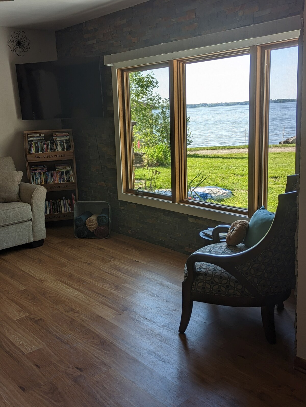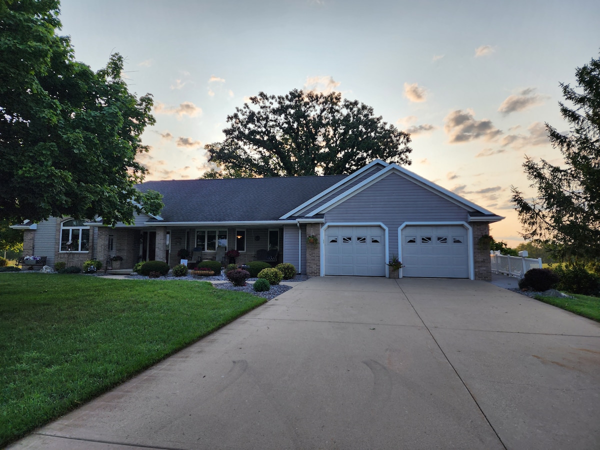Our 2 Bedroom, 1 Bathroom House is located directly on the shores of Lake Koshkonong. The back deck overlooks thousands of acres of lake with endless lake views. Just steps off the deck, one can enjoy the grassy landscape leading to the lakeside fire-pit. Then continue out onto the end of the 140 foot top notch pier. The pier (seasonally of course) includes a bench on the end and stairs into the water so that you can take a refreshing swim on our sandy bottom shoreline.
