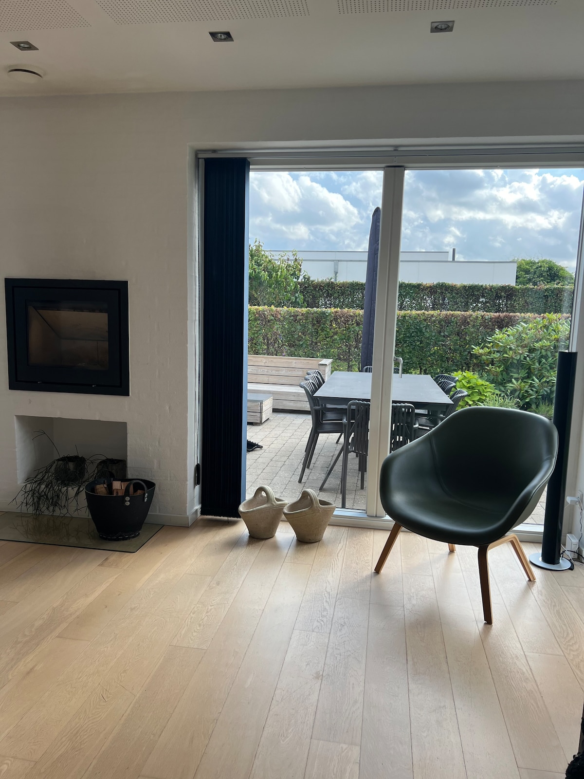 Relax in this unique and tranquil home overlooking Vejle Fjord, fields and forests. The house has a living room with kitchen, dining area and sofa area, toilet with shower and upstairs with bedroom. There are two elevation beds (double bed) as well as a single bed. Please note that the stairs to the 1st floor are a little steep and there is not so much space around the double bed. Outside, there are two terraces, both with views. There is a wood-burning stove with freely available firewood. Both bed linen and towels are included.