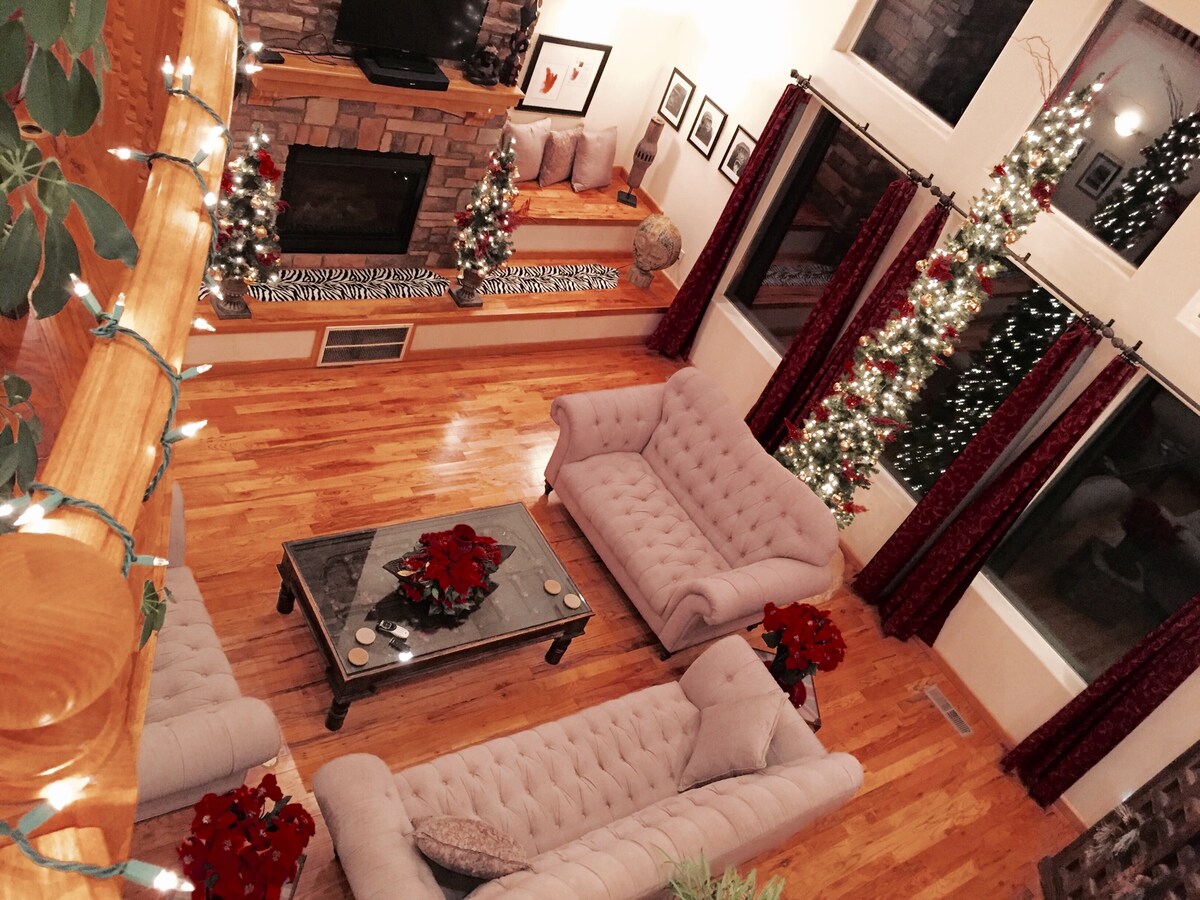 Stay in 2nd largest home in Kanab, popular for central location to scenic parks & tours. Upstairs "American Frontier Room" with landscape view, queen size bed + futon. En Suite, doored, private ATTACHED FULL BATHROOM. Shared access to kitchen (bring groceries), pool table, FAST wifi, etc Just 5 minutes drive from Kanab city center.