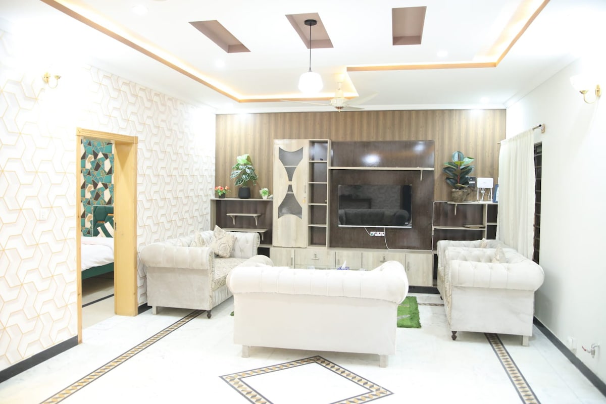 Detach yourself from the city & enjoy the serene life on the foothills of the Margallas. Minutes away from the city center, enjoy the tranquility and comfort of our cozy and modern home, fully furnished & loaded with amenities. - Luxurious bungalow with 4 double bedrooms equipped with LEDs, closets, attached bathrooms - TV Lounge with 65” Smart TV and multimedia (Netflix, 200 HD channels) & WiFi. - 24/7 security & Backup Power - Airport pickup, Breakfast and Chef available (for a small fee)