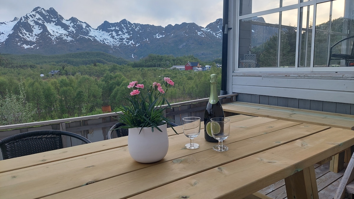 Welcome to our peaceful accommodation in the countryside with a balcony and beautiful views of the Lofoten mountains, the sea, the northern lights and the midnight sun. Own apartment on the 2nd floor in the garage with a balcony, bathroom, combined kitchen and living room with a double bed for two people, a sofa bed for two people and two extra guest beds. There is also a home cinema system. Short drive to Lofoten, moose safari, reindeer farm, whale watching and other nature experiences.