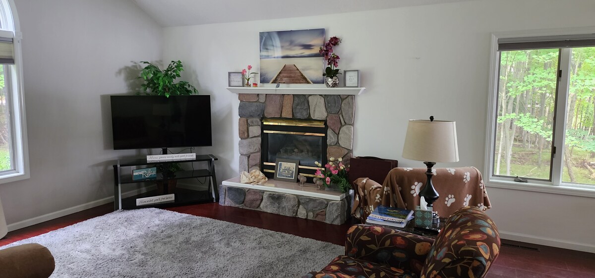 Cozy, attached, Handicap Accessible apartment in the woods with private entrance. One bedroom with queen bed and living room queen hide- a -bed couch . One bathroom with roll in shower. Complete kitchen, WiFi, Streaming TV, and Huge yard for kids and dogs. Indoor, Seasonal pool, heated May- Sept. Year round Hot Tub on the deck overlooking the woods. Secluded and very quiet but close to everything, just 10 minutes from downtown, shopping, restaurants, the beach and the state park.