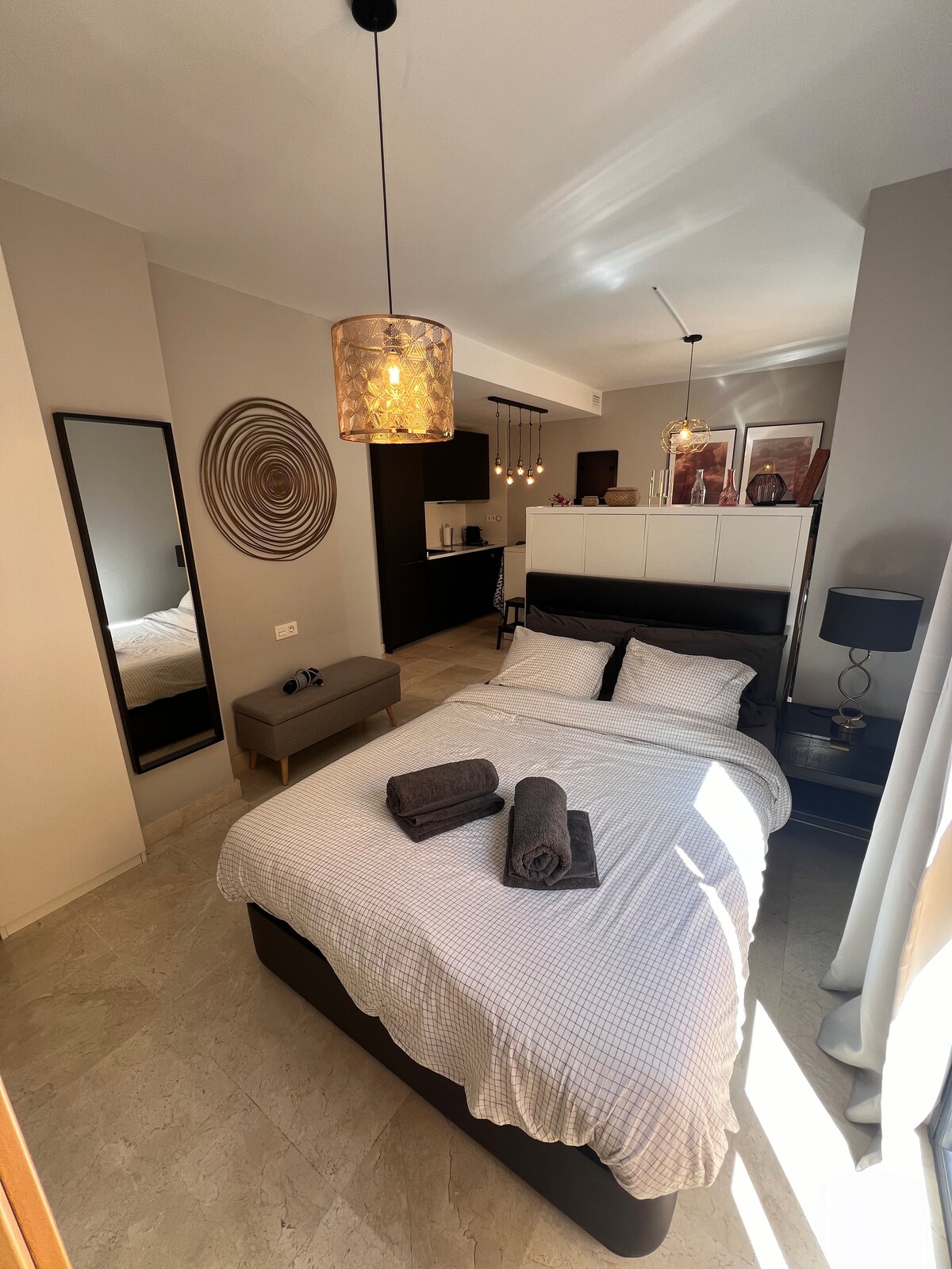 Our sea-front apartment is centrally located, perfect for couples looking to enjoy a few days in Málaga, with its beautiful beach, old town, and scenic surroundings. The apartment is spacious, bright, and offers stunning sea views. Fully renovated in 2019 and with regular updates, it features a bedroom area, full kitchen, bathroom with shower, open terrace, and living room. You'll have everything you need for a comfortable stay: a cozy bed, fast Wi-Fi, air conditioning, and a large smart TV.